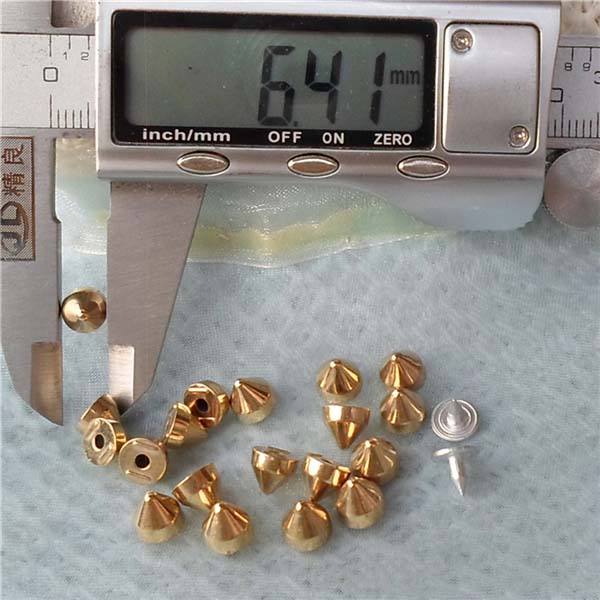 We can produce top quality brass/alloy/aluminum/stainless steel spikes. We can make to custom orders with a sample photo or designing draft. We are capable of making various tree spike, cone spike, hexagon spike, claw spike, bullet spike, pyramid stud, round stud, and rivets, for all kinds of rock and punk fashion garments and jewelries, especially for studded belts, bracelets, fashion bags and shoes, leather jackets, vests, leather pants, skirts and shoes.