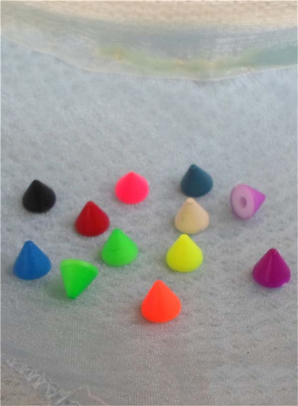 You can get various color spikes,studs,rivets and glow in dark spikes,studs,rivets ; plating: silver, gold, brass, antique brass, gun metal black, matte black, white, red, pink, purple, blue, green, fluorescent green/yellow/orange,glow in dark green/yellow/white/pink/orange/blue, etc.