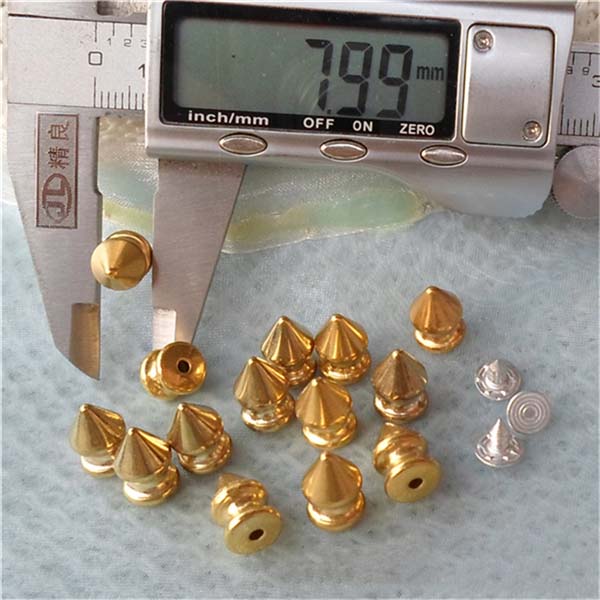 We can produce top quality brass/alloy/aluminum/stainless steel spikes. We can make to custom orders with a sample photo or designing draft. We are capable of making various tree spike, cone spike, hexagon spike, claw spike, bullet spike, pyramid stud, round stud, and rivets, for all kinds of rock and punk fashion garments and jewelries, especially for studded belts, bracelets, fashion bags and shoes, leather jackets, vests, leather pants, skirts and shoes.