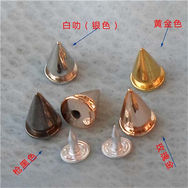 We can produce top quality brass/alloy/aluminum/stainless steel spikes. We can make to custom orders with a sample photo or designing draft. We are capable of making various tree spike, cone spike, hexagon spike, claw spike, bullet spike, pyramid stud, round stud, and rivets, for all kinds of rock and punk fashion garments and jewelries, especially for studded belts, bracelets, fashion bags and shoes, leather jackets, vests, leather pants, skirts and shoes.